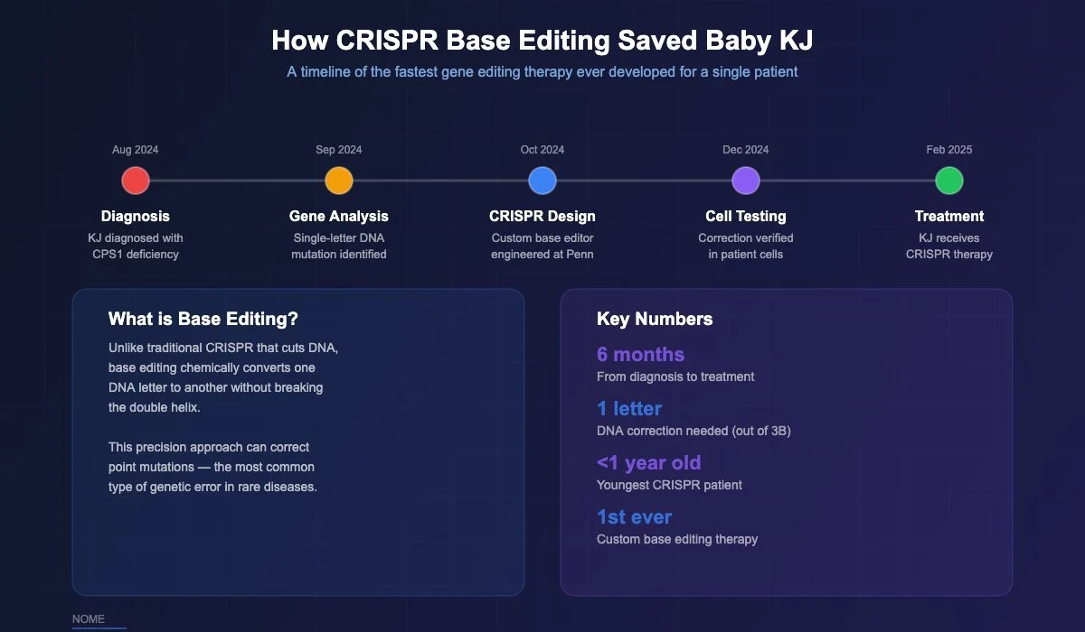When KJ was diagnosed in August 2024, they had a crucial insight: KJ's disease was caused by a single-letter mistake in his DNA. Out of 3 billion letters in the human genetic code, one was wrong. That one wrong letter was enough to shut down a critical enzyme and put his life at risk.