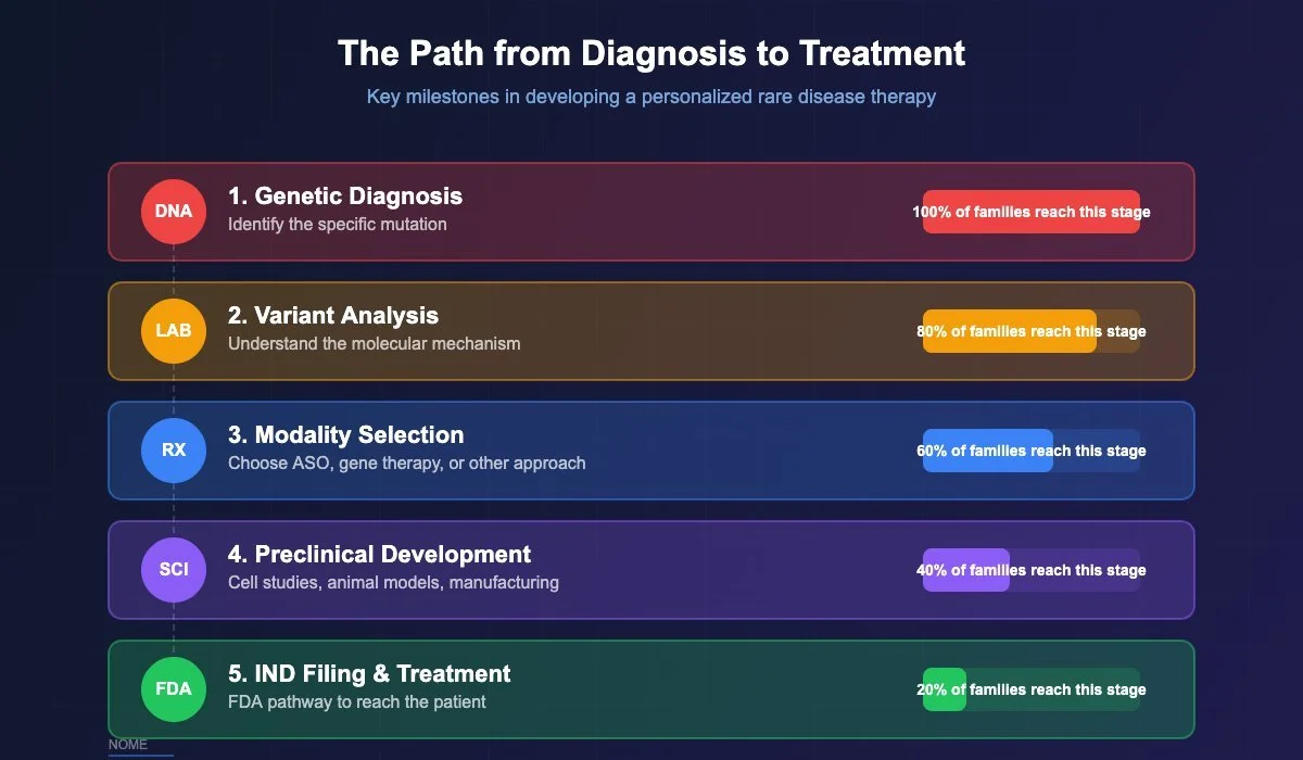 What follows is the process. Step by step, from diagnosis to treatment. It is aligned with the IRDiRC N-of-1 development roadmap and reflects how programs are actually executed today.